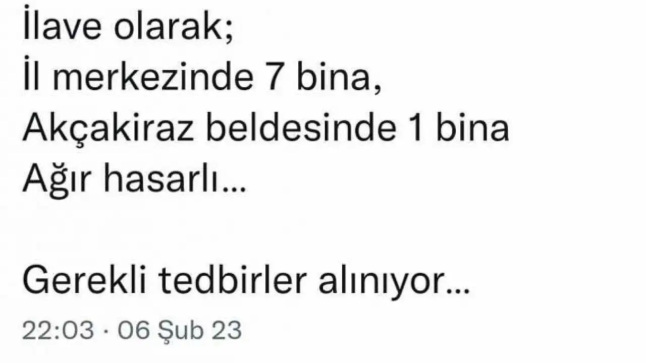 Elazığ Valisi Ömer Toraman, "Hasar tespit çalışmaları devam ediyor. İlave olarak, il merkezinde 7 bina, Akçakiraz beldesinde 1 bina ağır hasarlı. Gerekli tedbirler alınıyor" dedi.