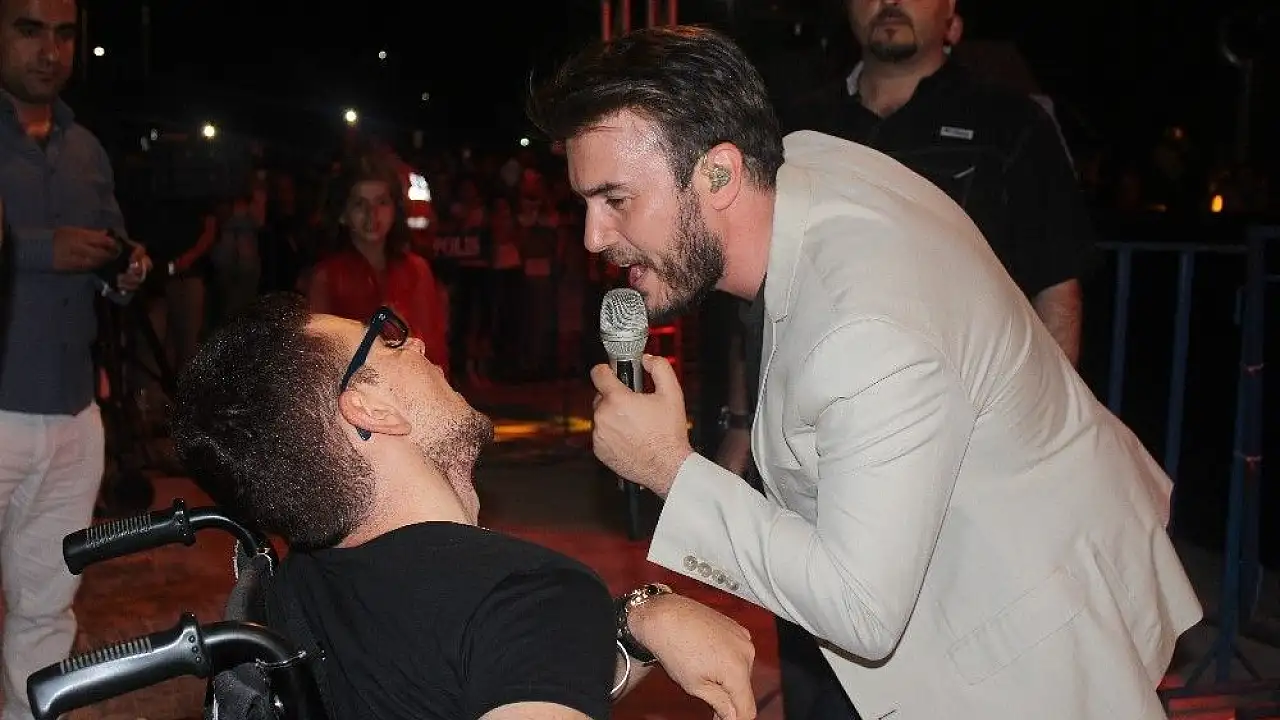 Elazığ’da Mustafa Ceceli rüzgarı esti. Ünlü sanatçı, sahne önünde engelli bir hayranını görünce yanına giderek onunla birlikte şarkı söyleyip özçekim yaptı.