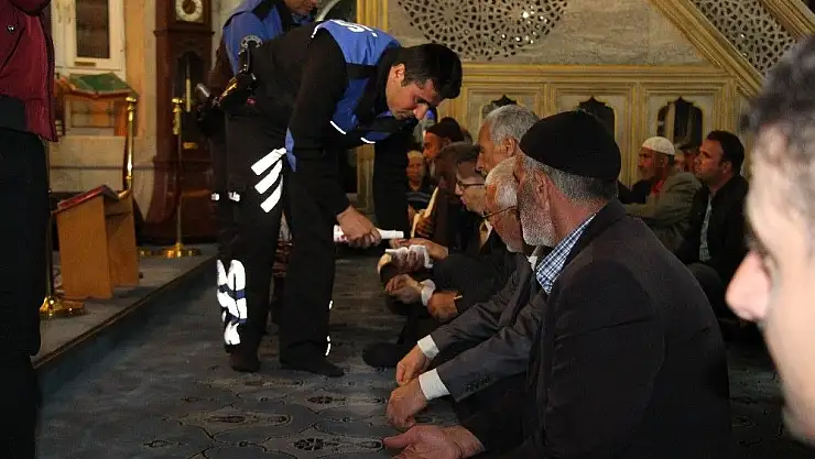 Mevlit programına katılanlara polis memurları, gül suyu ve lokum ikram etti.
