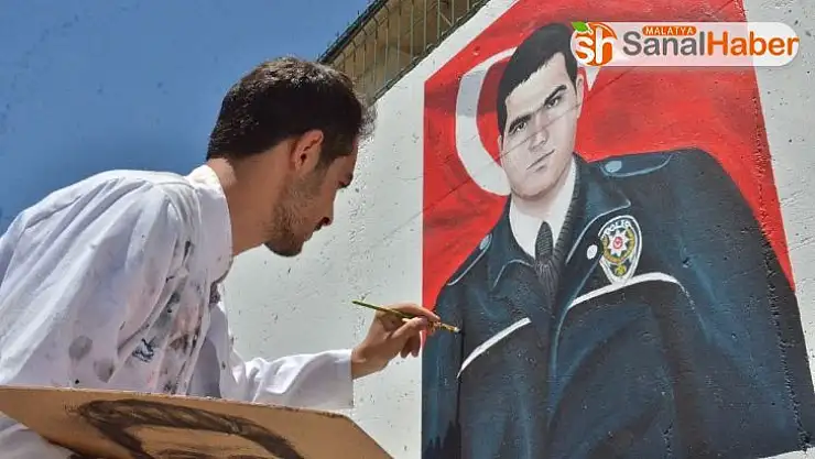 Kahramanmaraş’ın Elbistan ilçesinde şehit polislerin yağlıboya resimleri, Bölge Trafik Denetleme İstasyon Amirliğinin güvenlik duvarına çizildi.