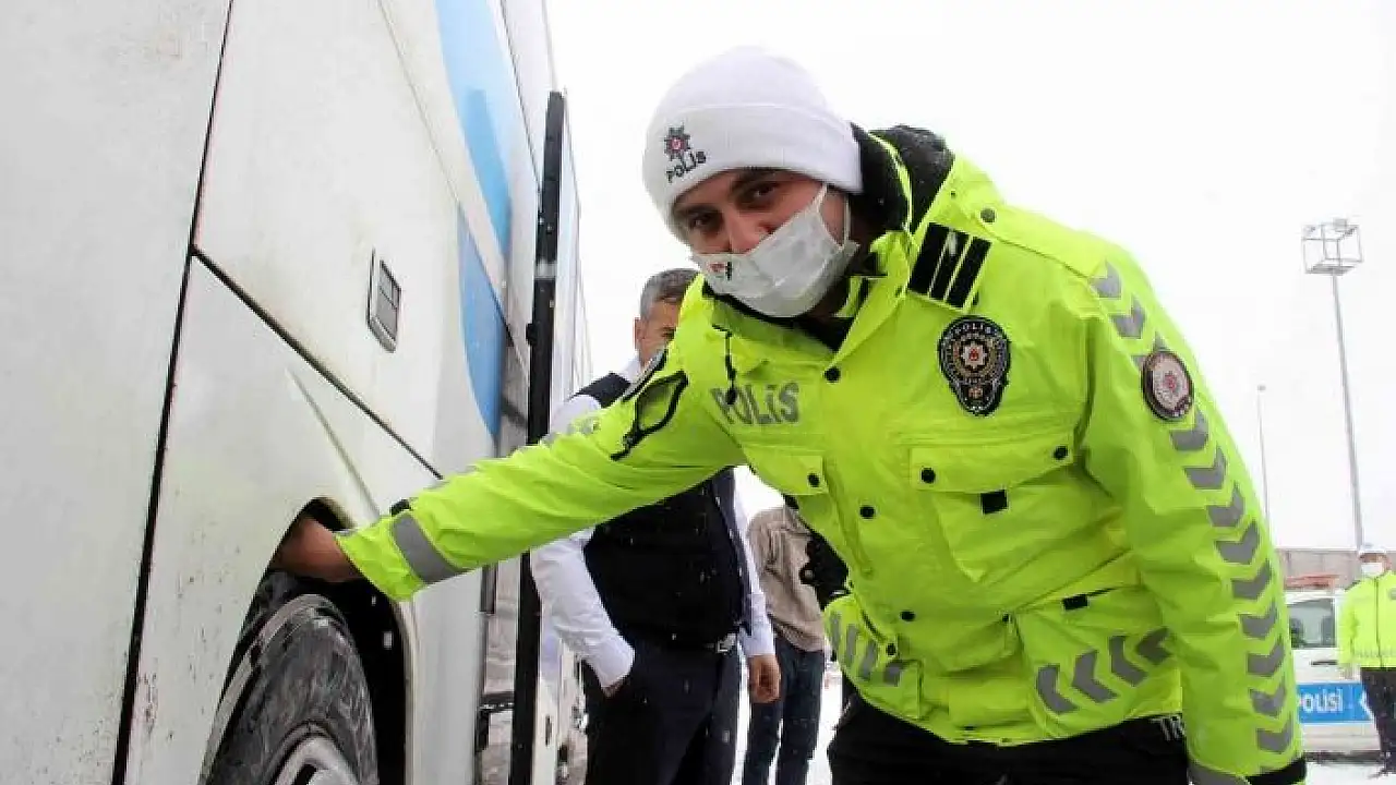 Sivas´ta polis ekipleri olumsuz hava koşullarında yaşanabilecek olumsuzları önlemek adına şehirlerarası yolcu taşıyan otobüslerde lastik denetimi yaparak yolcuları emniyet kemeri konusunda bilinçlendirdi.