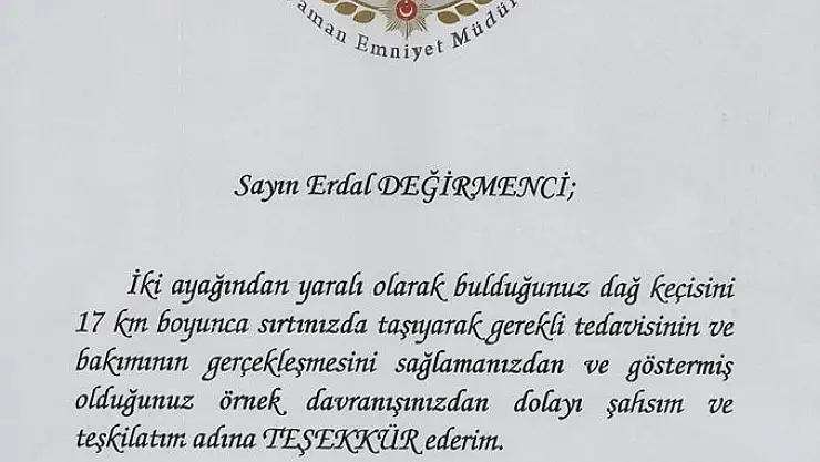 Emniyet Müdürü Metin Alper, Değirmenci’nin yaptığı örnek davranıştan dolayı kendisine tebrik kartı gönderdi. Müdür Alper’in göndermiş olduğu tebrik kartında, “İki ayağından yaralı olarak bulduğunuz dağ keçisini 17 kilometre boyunca sırtınızda taşıyarak gerekli tedavisinin ve bakımının gerçekleşmesini sağlamanızdan dolayı ve göstermiş olduğunu örnek davranıştan dolayı şahsım ve teşkilatım adına teşekkür ederim” ifadeleri yer aldı.