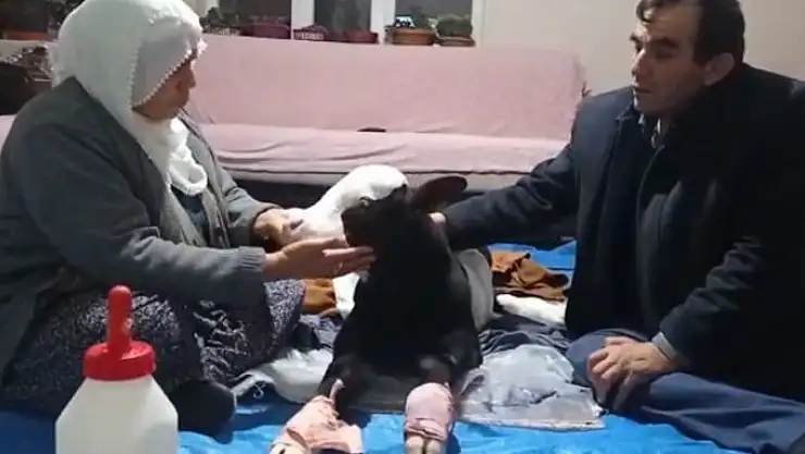 "Bu hayvan 15 gün erken doğdu. 20 gündür de evde bakıyorum. Veteriner getirdik. Buzağının ahırda kalırsa yaşayamayacağını söyledi. Biz de eve getirdik. Erken doğduğu için pis yerde yaşamaz dedikleri için evde bakıyoruz. Gözleri görmüyor. Ayağının biri sakat. Karnının altında da açıklık var. Oraya buraya çarpıyor. Kanepenin birinde eşim, diğerinde ben birinde de bu yatıyor. 3 gece ve 3 de gündüz olmak üzere 6 kere bez değişiyoruz."