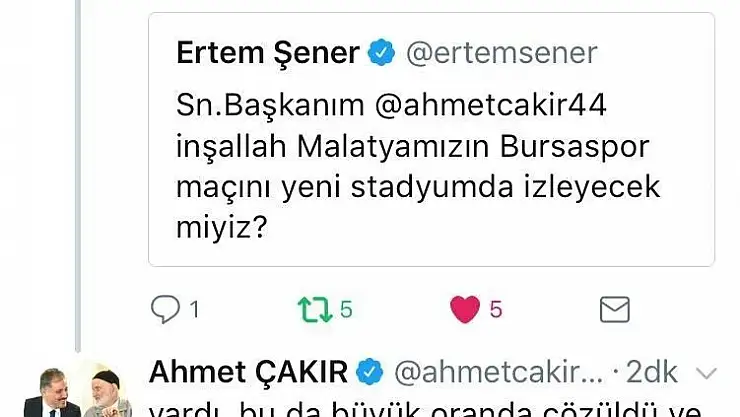 Şener’in sosyal medya hesabından, “Sayın başkanım inşallah Malatya’mızın Bursaspor maçını yeni stadyumda izleyecek miyiz” sorusuna başkan Çakır şu cevabı verdi: