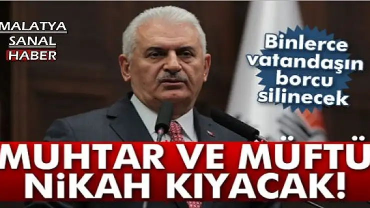 Başbakan Binali Yıldırım, partisinin grup toplantısında yaptığı konuşmada, köy muhtarları ve müftülere nikah kıyma yetkisi verileceğini açıkladı.