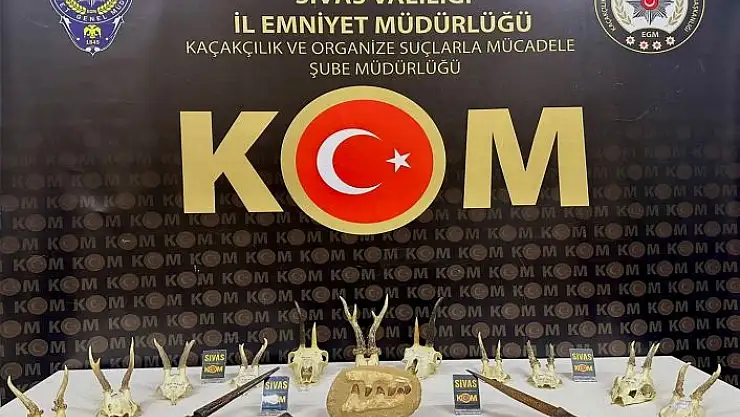 Sivas İl Emniyet Müdürlüğü Kaçakçılık ve Organize Suçlarla Mücadele Şube Müdürlüğü ekiplerince, kaçakçılık olaylarını engellemek maksadıyla kentte bir eve ve eklentilerine operasyonda düzenlendi. Sivas Cumhuriyet Başsavcılığı koordinesinde düzenlenen operasyonda; 11 adet nesli tehlike altında olan hayvan türüne ait kafatası ve boynuzu, 2 adet tarihi eser niteliğinde hançer-kama, 1 adet tarihi eser niteliğinde mühür, 1 adet trilobit böcek fosili, 1 adet mosasauros deniz canlısı fosili, 1 adet deniz kabuğu fosili ele geçirildi. Olaya ilişkin, bir şahsa 5607 sayılı Kaçakçılıkla Mücadele Kanunu ve 2863 Sayılı Kültür ve Tabiat Varlıklarını Koruma Kanuna Muhalefet suçundan yasal işlem yapıldı.