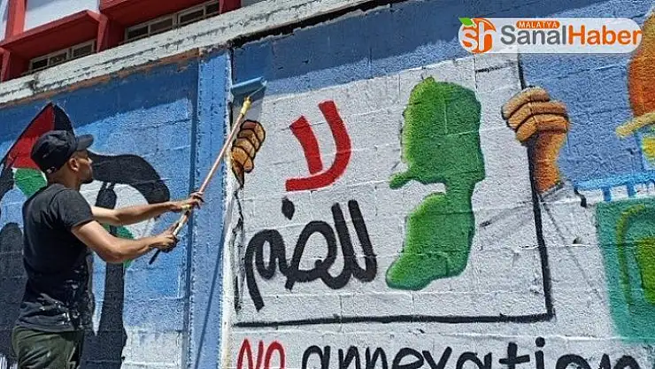 Gazze’de yaşayan Filistinli gençler çizdiği grafitilerle İsrail’in ilhak planını reddetti. Filistinli gençler, duvara yaptıkları resimlerin yayında “ilhaka hayır” yazdı.