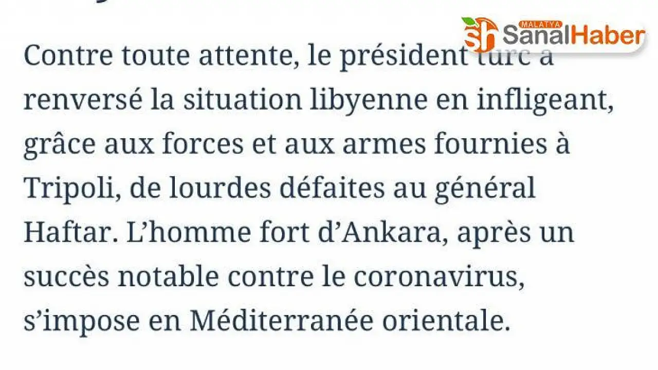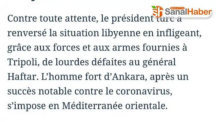 Fransa’nın ünlü gazetelerinden Le Figaro’da bugün Jean-Marc Gonin, makalesine “Libya’nın Sultanı Erdoğan” başlığını attı. Gonin, makalede Hafter’in Libya’da büyük kayıplar verdiğine değinerek, bu kayıplara Cumhurbaşkanı Erdoğan’ın hamlelerinin neden olduğunu aktardı. Gonin, Hafter’in Ulusal Mutabakat Hükümeti’nin (UMH) yaptığı başarılı operasyonlar sonucunda kaybettiği bölgeler için “Erdoğan’ın eseri” dedi.