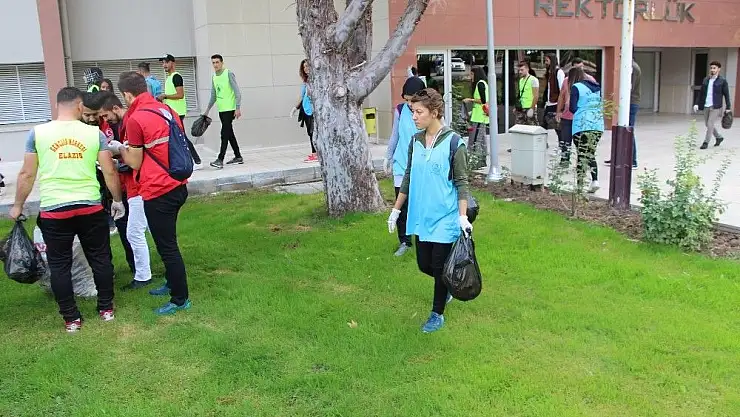 Fırat Üniversitesi (FÜ) kampüsünde öğrenciler çöpleri topladı.