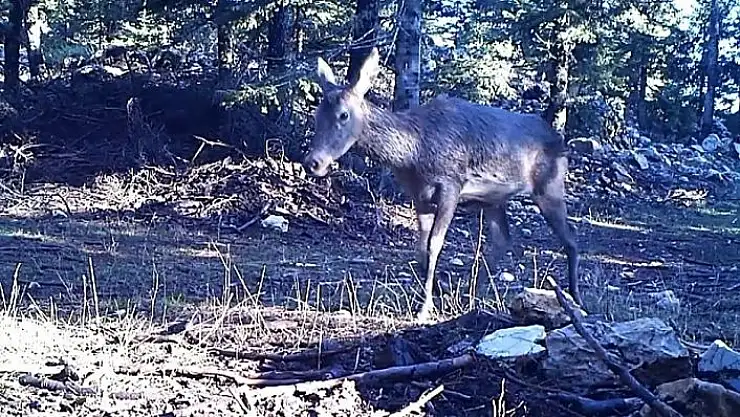 Kahramanmaraş´ın Başkonuş Yaylası´nda yaklaşık bir metre karla kaplı ormanlık arazilere yaşayan geyikler için yem bırakıldı. Foto kapanlarla bölgedeki geyiklerin beslenmeleri görüntülendi.