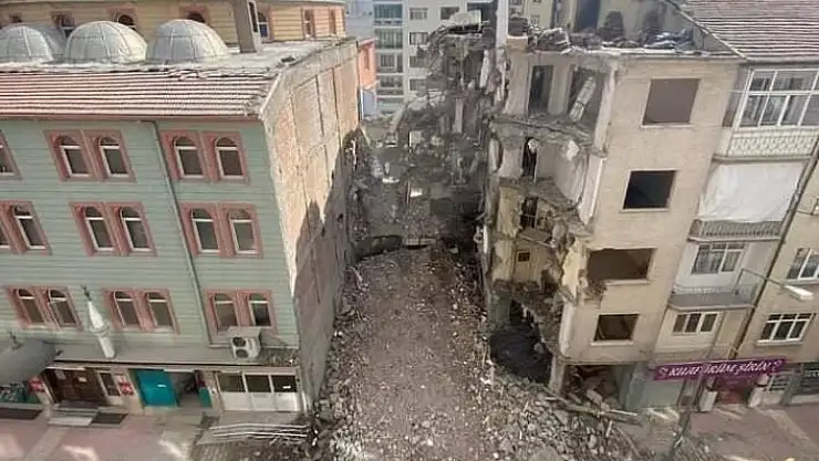 Elazığda ağır hasarlı binanın yıkımı sırasında yanda bulunan sağlam caminin duvarı zarar gördü.Elazığda 6 Şubat Kahramanmaraş merkezli depremler nedeniy
