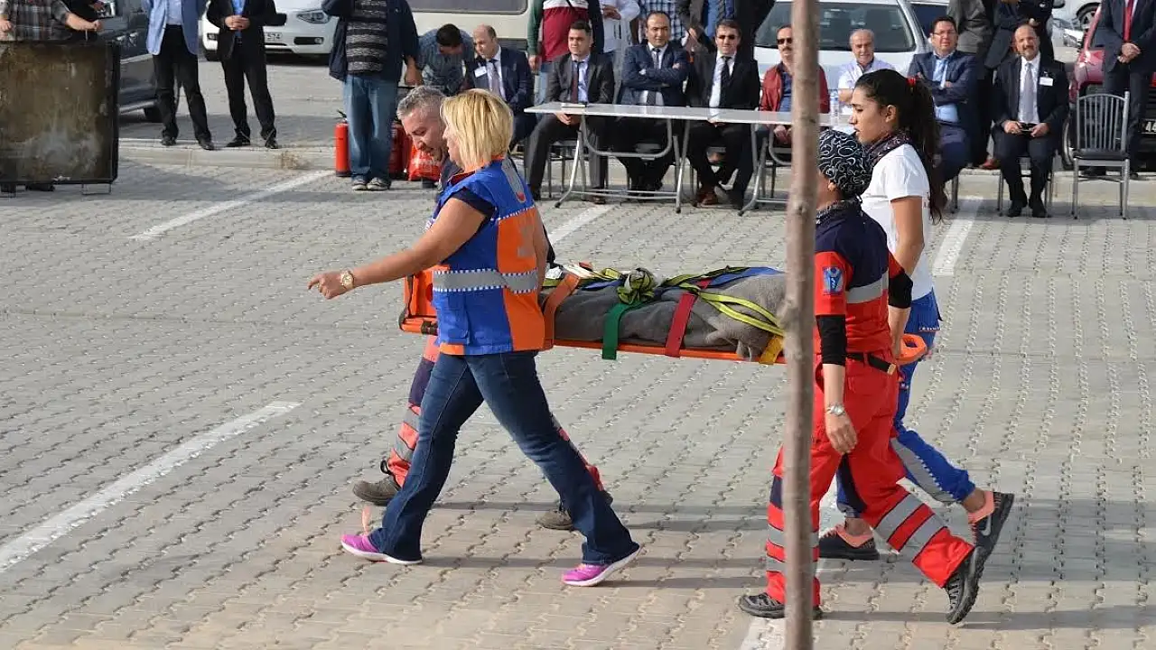 İtfaiye ekibi, senaryo gereği hastanenin üst katlarında mahsur kalan kazazede, UMKE’nin yaptığı tedavinin ardından salınan sedye ile, merdivenli kurtarma aracı ile indirilerek kurtarıldı. AFAD Arama Kurtarma Ekibi de çatı katında mahsur kalan bir yaralıyı iple sarkıtarak kurtarmaya çalışması göz doldurdu. Daha sonra enkazda arama kurtarma ve acil ilk yardımı yapıldı. Yangın söndürme tüpleri ile temsili yangına müdahale edilerek, personellere yangın söndürücülerin kullanımı hakkında bilgi verildi.