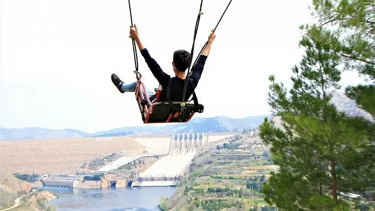 Elazığ´daki Keban Baraj gölü kıyısındaki yüksek bir tepeye kurulan dev salıncak hem korku, hem de keyif verirken, kısıtlamanın kaldırılmasıyla bayramdan sonra hizmete açılacağı belirtildi.