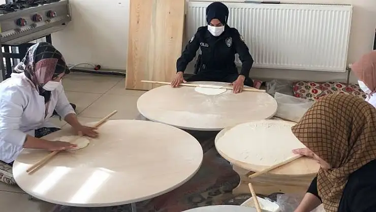 Sivas´ta kadın polis memuru KADES uygulamasını tanıtmak için bir araya geldiği kadınlarla birlikte hamur yoğurup yufka açtı, dikkat çeken kadın dayanışması yürek ısıtan görüntüler oluşturdu.