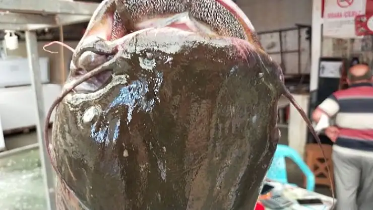 Kahramanmaraş´ta bir balıkçı esnafında satışa sunulan yayın balığı görenlerin ilgi odağı oldu.