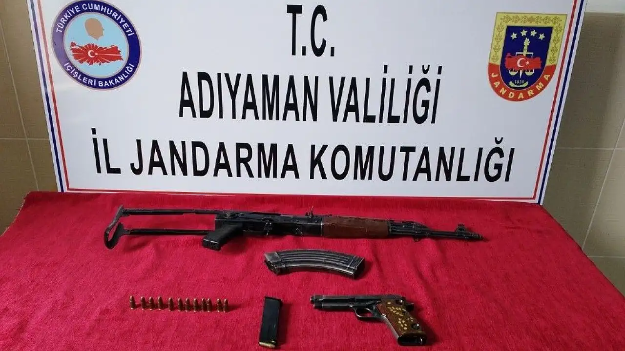 Edinilen bilgiye göre, Adıyaman İl Jandarma Komutanlığı ekipleri Merkez Karababa Köprüsü mevkiinde icra edilen yol emniyet ve kontrol faaliyetinde durumundan şüphelenilen bir aracı durdurdu. Araç içerisinden yapılan aramda, 1 adet Kaleşnikof marka piyade tüfeği ve bu tüfeğe ait 1 adet şarjör, 1 adet 9 mm çapında tabanca ve bu tabancaya ait 1 adet şarjör ile 5 adet tabanca fişeği ele geçirildi.