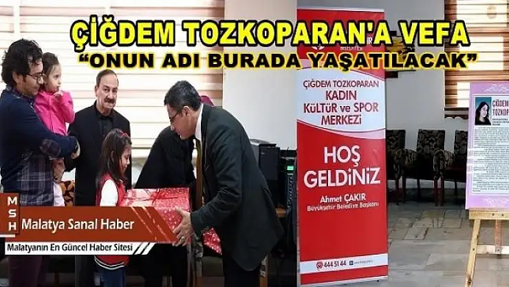 Programda, Çiğdem Tozkoparan’ın ailesine, Kadın Kültür ve Spor Merkezi’ne adının verilmesi ile ilgili olarak hazırlanan belge de takdim edildi. Ayrıca merhume Tozkoparan’ın küçük yaşlardaki iki kız çocuğuna de çeşitli hediyeler verildi. Malatya Büyükşehir Belediyesi, daha önce de kalp krizi sonucu vefat eden Basın Yayın ve Halkla İlişkiler Müdürü merhum Cemal Aslan’ın ismini, Koyunoğlu Mahallesi’ndeki Temel Beceri ve Eğitim Merkezi’ne vermişti.