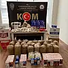 Yapılan aramada, 200 kilogram kıyılmış tütün, 3 bin 100 adet doldurulmuş makaron sigara, 45 bin dal boş makaron, 10 kilogram nargile tütünü, 15 bin adet sigara sarma kağıdı, 100 tablet cinsel içerikli ilaç, 21 bin adet sigara sarma pamuğu ele geçirildi.