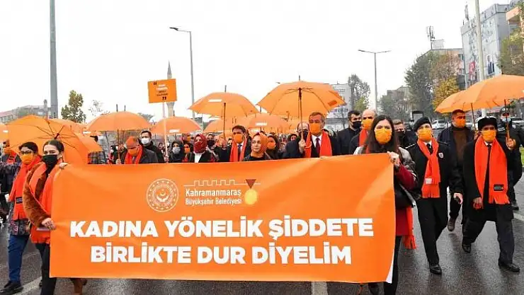 Kahramanmaraş´ta, 25 Kasım Kadına Yönelik Şiddete Karşı Mücadele ve Uluslararası Dayanışma Günü dolayısıyla Büyükşehir Belediyesi, Valilik ile Aile ve Sosyal Hizmetler İl Müdürlüğü işbirliğiyle yürüyüş etkinliği düzenlendi.