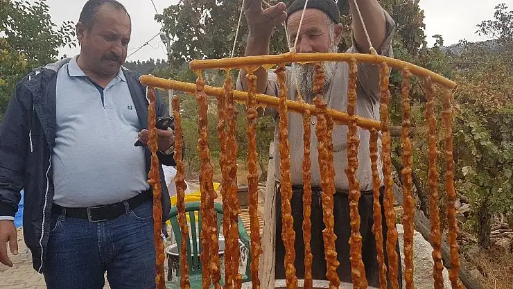 Türkiye’nin birçok noktasına satışı yapılan sucuk, üzüm pekmezi ve ceviz ile hazırlanıyor. Büyük kazanlarda pişirilen pekmez, ipe dizili cevizin karışımıyla ortaya sucuk çıkıyor.