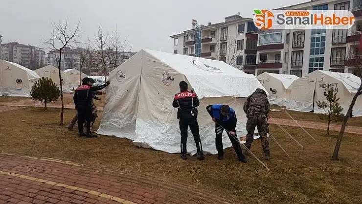 Elazığ’da meydana gelen 6.8’lik deprem sonrasında tüm kurumların yaptığı gibi İl Emniyet Müdürlüğü personeli de kapı kapı gezip yardımları ulaştırırken, çadırlar kurup depremzedelerin acısına ortak oluyor.