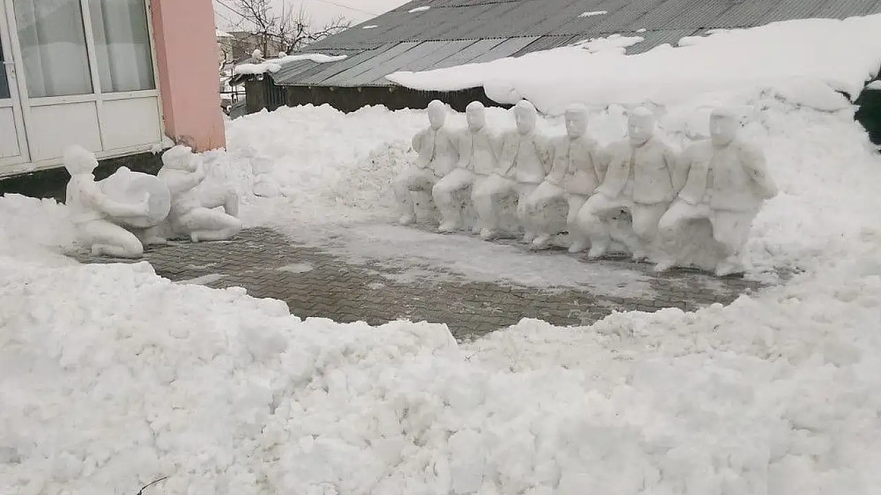 Adıyaman’ın Çelikhan İlçesinde bir heykel tıraş, yağan kara şekil vererek folklor ekibi oluşturdu.