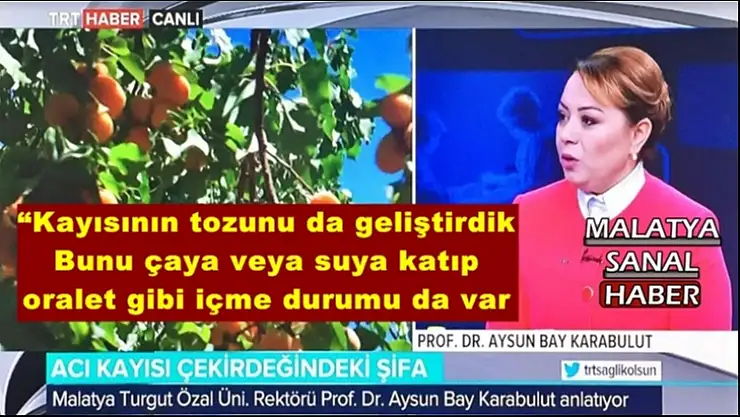 Malatya Turgut Özal Üniversitesi Rektörü Prof. Dr. Aysun Bay Karabulut, TRTHaber’de yayınlanan “Sağlı Olsun” programına katılarak, Geleneksel Tıp ve acı kayısı çekirdeği üzerinde yapılan bilimsel çalışmalar hakkında açıklamalarda bulundu.
