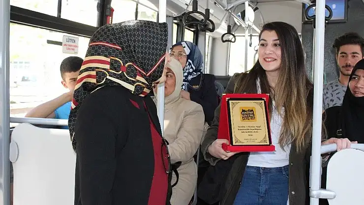 Malatya Kent Konseyi Koordinatörü Hatice Albayrak, Genç Yolcu’ya bu duyarlı davranıştan dolayı plaket takdim etti. Albayrak, “Malatya Kent Konseyi olarak bu sene başlattığımız ‘Kendine ve Kentine Saygı Duy’ projesi kapsamında gençlerimizin ne derece duyarlı olduklarını ölçmek istedik. Bu hassasiyetiniz için teşekkür ediyoruz ve bu davranışınızın tüm gençlere yansımasını temenni ediyoruz” şeklinde konuştu.