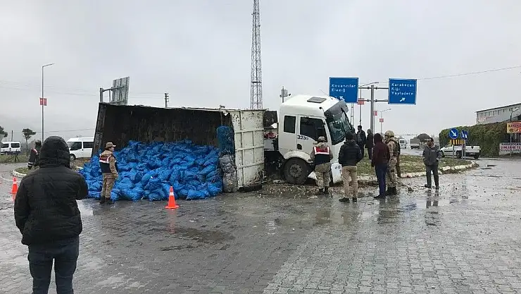 Elazığ-Bingöl yolunda kömür yüklü kamyon devrildi, sürücü yaralandı.