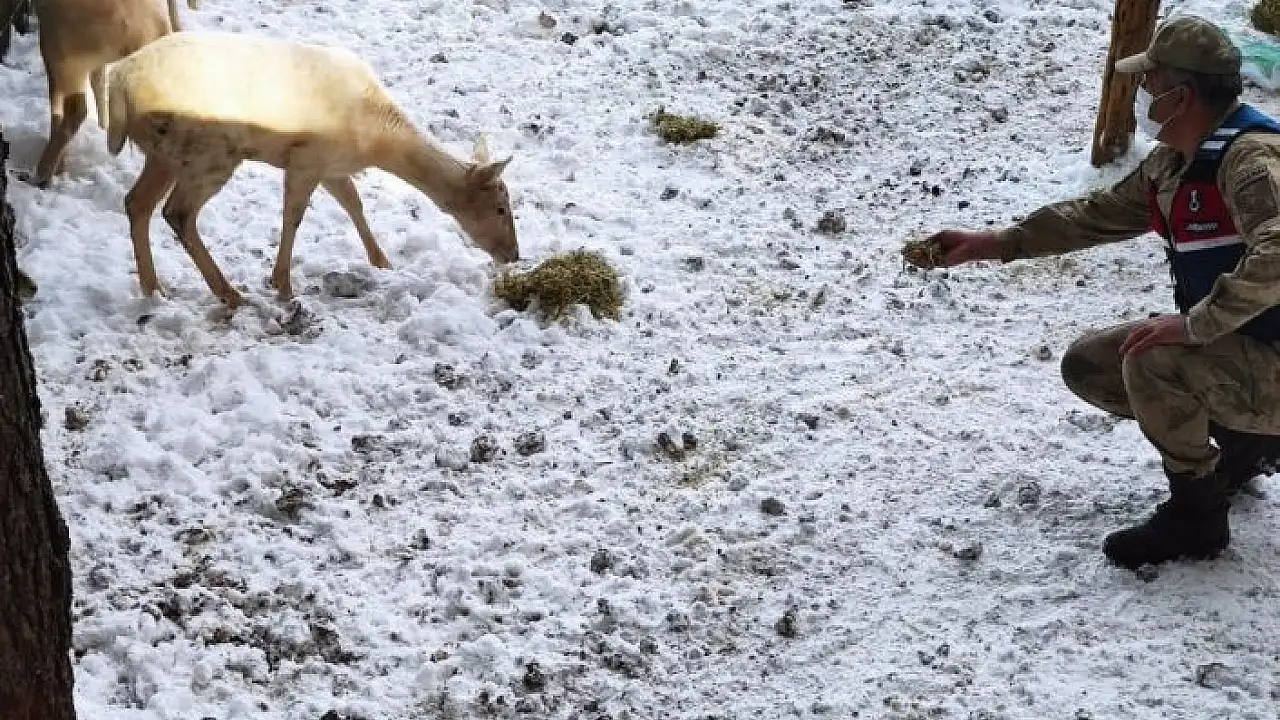 Kahramanmaraş´ta koruma altında bulunan geyikler için jandarma tarafından yem bırakıldı.