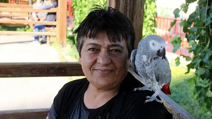 Sivas´ta 13 yıl önce kredi çekerek aldığı papağanını yanından ayırmayan Hateme Karabulut, her yere papağanıyla gidiyor.
