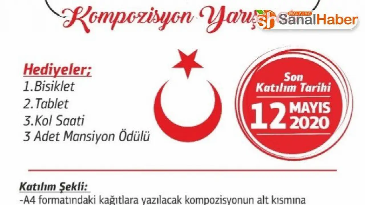 Büyükşehir Belediyesi Kültür ve Sosyal İşler Dairesi Kadın Aile ve Gençlik Hizmetleri Şube Müdürlüğü tarafından Atatürk’ü Anma Gençlik ve Spor Bayramı dolayısıyla düzenlenen kompozisyon yarışması Malatya’daki lise öğrencilerine açık olacak. Yarışmada ilk 3’e girenler ile 3 kişiye mansiyon olmak üzere toplam 6 esere ödül verilecek. Birinciye bisiklet, ikinciye tablet, üçüncüye ise kol saati hediye edilecek.