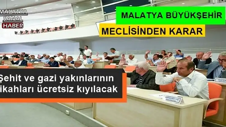 Malatya Büyükşehir Belediyesi meclisinde alınan karar ile bundan sonra şehit ve gazilerin birinci derece yakınlarının nikah işlemlerinde ücret alınmayacak.