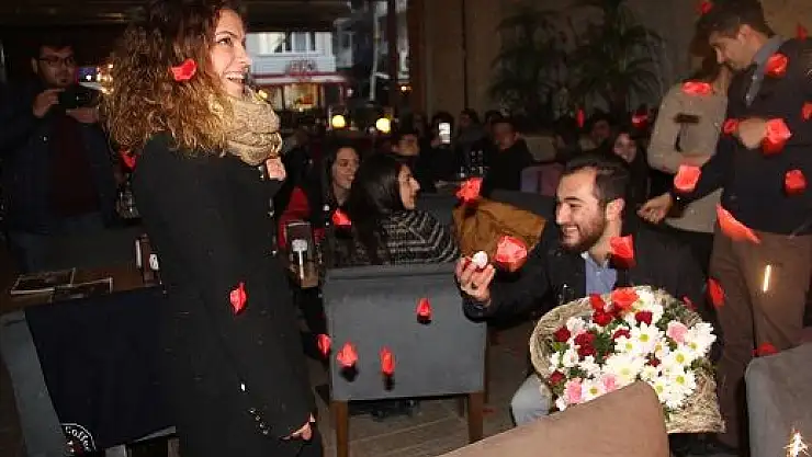Sevdiği kız için sürpriz bir evlenme teklifi planlayan İnönü Üniversitesi öğrencisi 22 yaşındaki Esat Erdoğan isimli genç aşık, bir kafede sevdiği kıza aşkını haykırdı. Her şeyden habersiz kafeye gelen Emine Polat, sevgilisinin sürpriz evlenme teklifiyle karşılaştı. Üzerinde ‘Benimle evlenir misin?’ yazılı pankart açan genç aşık, sevdiği kıza diz çökerek evlenme teklifi etti. ‘Evet’ cevabını alan genç aşıklar daha sonra pasta keserek ve fotoğraf çektirerek, en mutlu oldukları anı ölümsüzleştirdiler.