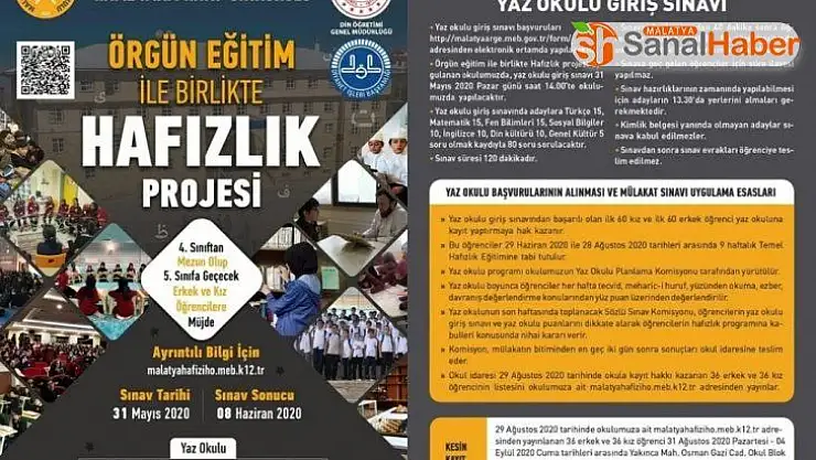 Sınava başvurular 1 Nisan’da başlarken, 24 Mayıs 2020 tarihinde sona erecek. Başvurular, http://malatyaarge.meb.gov.tr/form/ adresinden elektronik ortamda alınacak. İlkokul 4’üncü sınıftaki kız ve erkek öğrenciler sınava kayıt olabilecek. Öğrenci velileri çocuklarının kayıtlarını yaptırarak 31 Mayıs’ta sınava girmelerini sağlayabilecek. Sınav sonucuna göre 60 kız öğrenci 60 erkek öğrenci olmak üzere 120 öğrenci yaz okuluna katılmaya hak kazanacak. 29 Haziran - 28 Ağustos tarihleri arasındaki Yaz okulu sonunda da Hafız İmam Hatip Ortaokuluna devam edecek öğrenciler belirlenecek. Detaylı bilgi için okulun resmi web sayfası http://www.malatyahafiziho.meb.k12.tr ziyaret edilebilir.