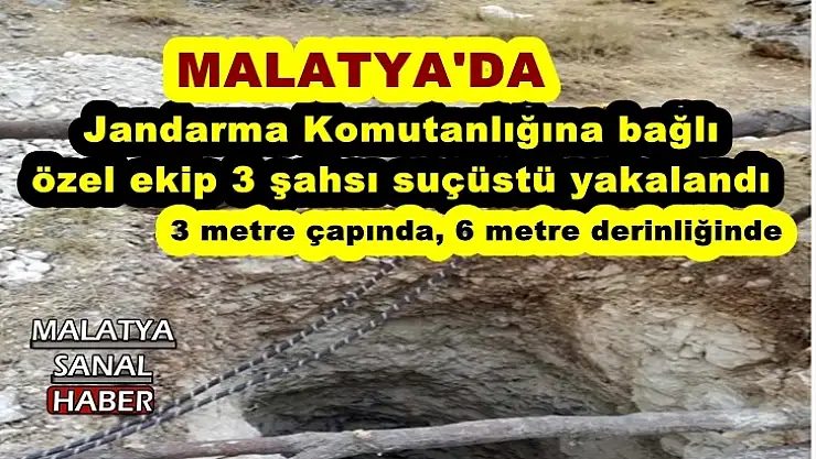 Malatya İl Jandarma Komutanlığı tarafından yapılan istihbari çalışmalar sonucunda Doğanşehir ilçesi Sürgü Mahallesi’nde 3 kişinin kaçak kazı yaptığı belirlendi. Bunun üzerine hemen harekete geçen İl Jandarma Komutanlığına bağlı özel ekip, bölgede 3 şahsı kaçak kazı yaptıkları esnada suçüstü yakaladı. Define arayan şahısların 3 metre çapında, 6 metre derinliğinde çukur açtıkları ve çukuru aydınlatmak için jeneratör kullandıkları tespit edildi.