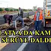 Malatya’da şehirlerarası yolda yaşanan kazada bir kamyon koyun sürüsüne çarptı. Kazada 8 koyun telef oldu.