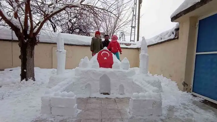 Yoğun kar yağışının devam ettiği Malatya´da tatili fırsat bilen baba ve kızları kardan cami yaptı