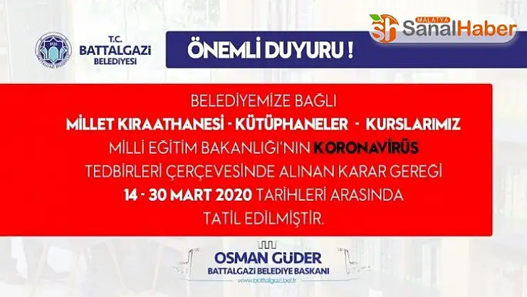 Malatya Battalgazi Belediyesi, koronavirüs önlemlerine yönelik millet kıraathanesi, kütüphaneler ve kursları belli bir süreliğine kapattı.