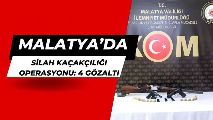 Malatya´da düzenlenen silah kaçakçılığı operasyonunda 2 adet tabanca, 3 adet tabanca şarjörü, 52 adet tabanca fişeği ile 1 adet tüfek ele geçirildi. Operasyonda 4 zanlı gözaltına alındı.