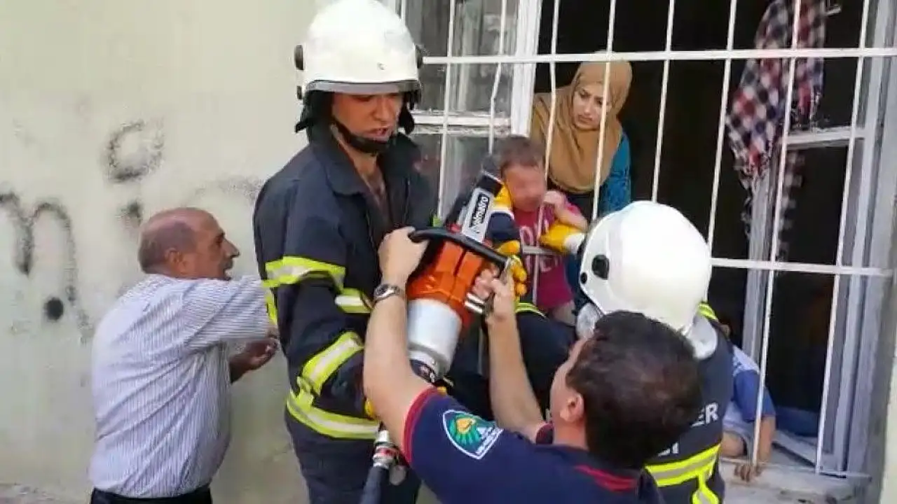 Malatya’da Suriyeli minik Rijad’ın kafası pencerenin demir korkuluklarına sıkışınca yardımına itfaiye ekipleri yetişti.