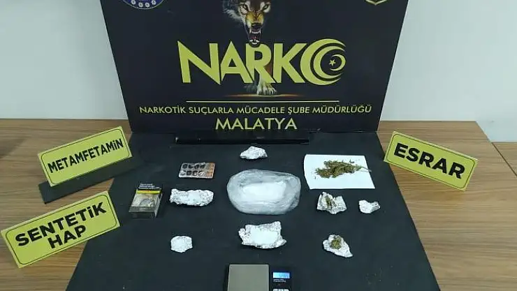 Malatya Emniyet Müdürlüğü Narkotik Suçlarla Mücadele Şube Müdürlüğü ekiplerince torbacı olarak tabir edilen sokak satıcılarına yönelik düzenlenen operasyonda 38,5 gram metamfetamin, 12 gram esrar, 4 adet yeşil reçeteye tabi hap ele geçirildi.