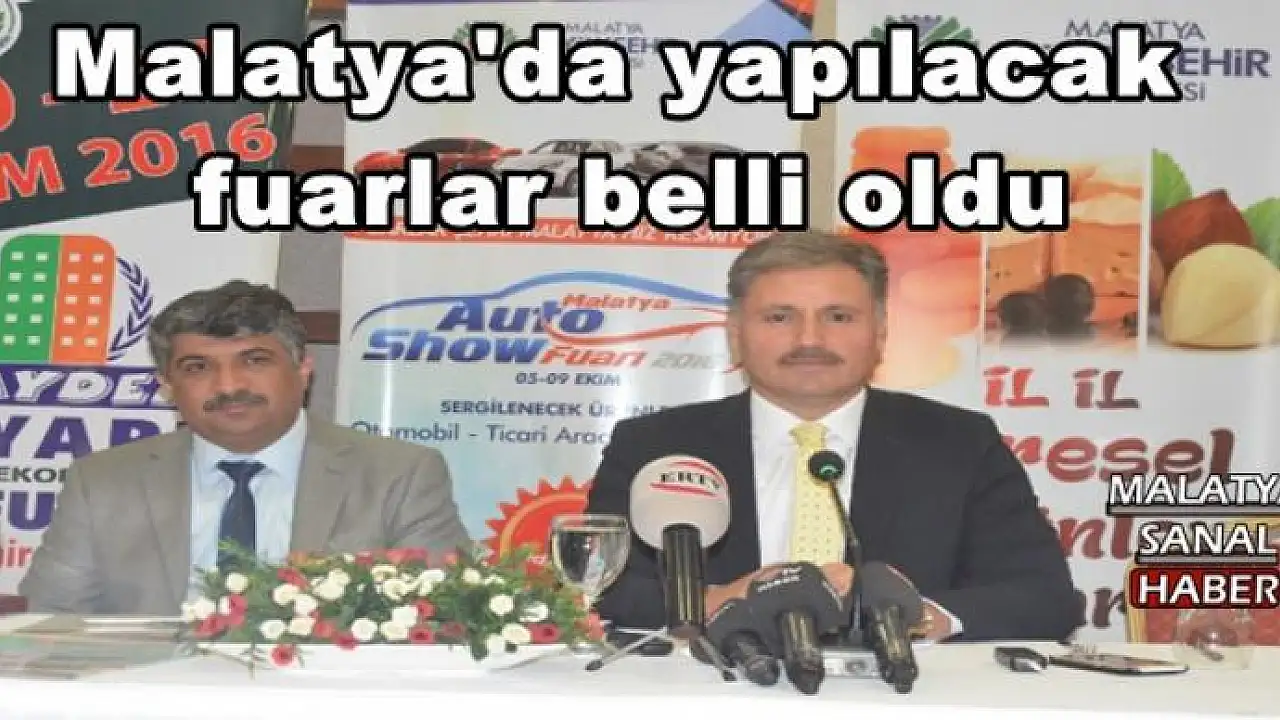 Malatya Büyükşehir Belediyesi fuarcılık hizmetlerine hız kesmeden devam ediyor. Bu kapsamda Malatya’da, 05-09 tarihleri arasında, otomobil, ticari araçlar ve aksesuarların sergileneceği ‘Malatya Auto Show Fuarı’ ile 20-23 Ekim tarihleri arasında ‘4. Yapı ve Dekorasyon Fuarı’ ve 28 Ekim-06 Kasım tarihleri arasında ise ‘İl İl Yöresel Ürünler Fuarı’ düzenlenecek.