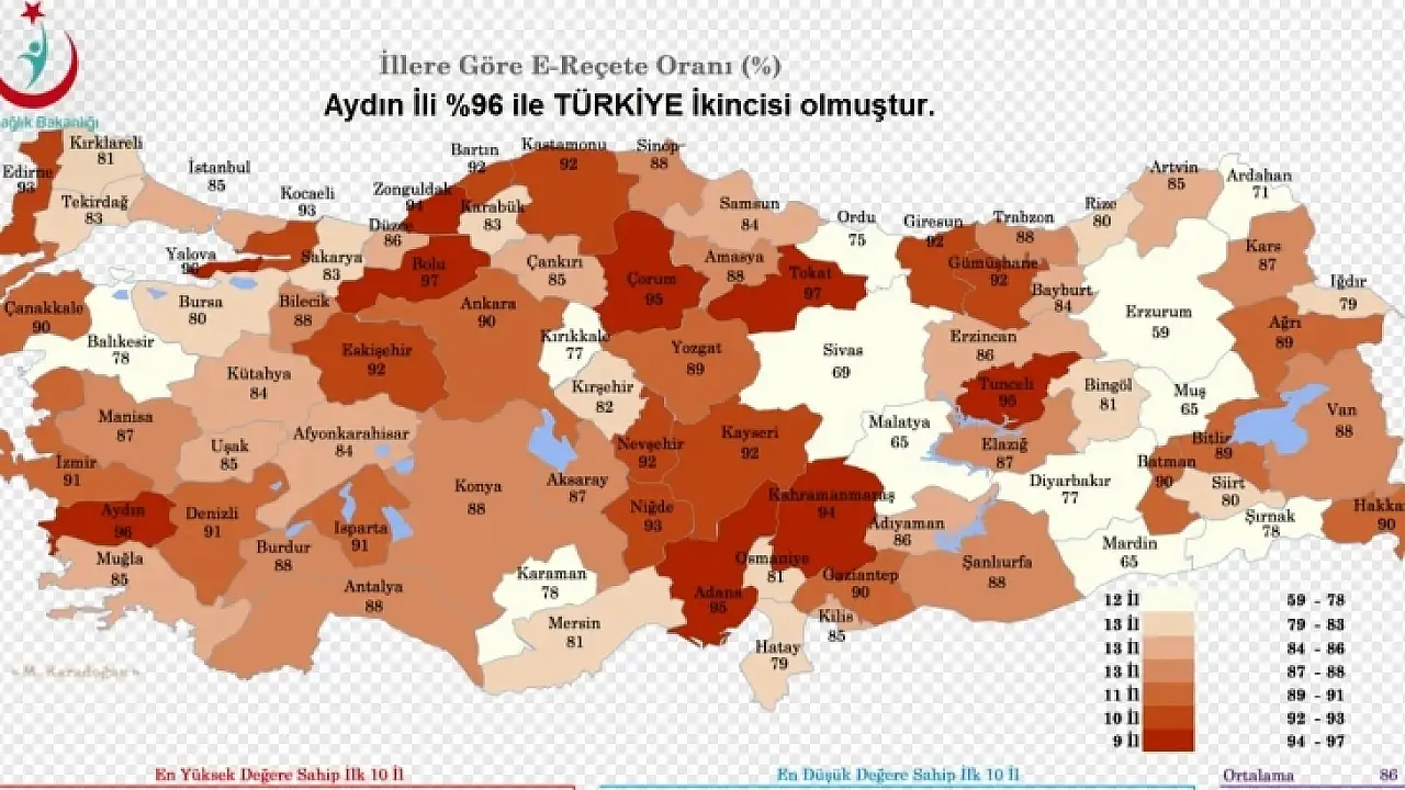 Yayımlanan verilere göre e-reçete yazılan en yüksek oranlı iller sıralamasında, yüzde 97 ile Tokat ve Bolu birinciliği paylaşırken, yüzde 96 ile Yalova ile Aydın ikinci, yüzde 95 ile Adana, Çorum ve Tunceli ise üçüncü oldu. En düşük oranlı il ise Erzurum oldu. Diğer illere göre en düşük e-reçete yazılan iller ise yüzde 65’er oranlarıyla Malatya, Muş ve Mardin oldu.