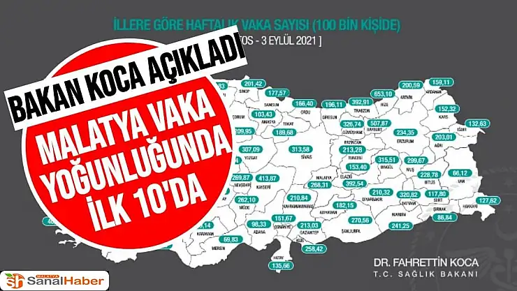 Bakan Koca, 28-Ağustos-3 Eylül arasında vaka yoğunluğu bir önceki haftaya göre en çok artan 10 ili de bildirdi. Buna göre iller sırasıyla, Kayseri, Elazığ, Karaman, Bolu, Malatya, Kırşehir, Yozgat, Kırıkkale, Tunceli, Bartın olarak kaydedildi. Bakan Koca, vatandaşlara bu illerden birinde olmaları durumunda daha da dikkatli olmaları gerektiğini işaret ederek, “Nihai çözüm aşı! Kurallar çok gerekli” dedi.