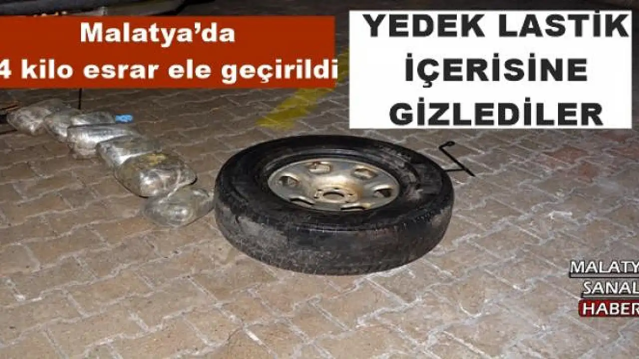 Malatya-Kayseri karayolunda yapılan yol uygulamasında bir aracın yedek lastiği içerisine gizlenmiş 14,4 kilogram esrar maddesi ele geçirildi.