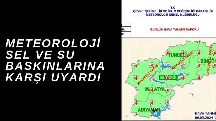 Meteoroloji 13. Bölge Müdürlüğünden yapılan açıklamada, Yapılan son değerlendirmelere göre; Elazığ, Bingöl, Malatya ve Tunceli çevrelerinde yerel olarak kuvvetli (21-50 kg/m2) sağanak ve gök gürültülü sağanak yağışlı olacağı tahmin ediliyor. Kuvvetli yağışlarla birlikte sel, su baskını, yıldırım, ulaşımda aksamalar, yağış anında kuvvetli rüzgar ve yerel küçük çaplı dolu yağışı gibi olumsuzluklara karşı dikkatli ve tedbirli olunmalıdır denildi.