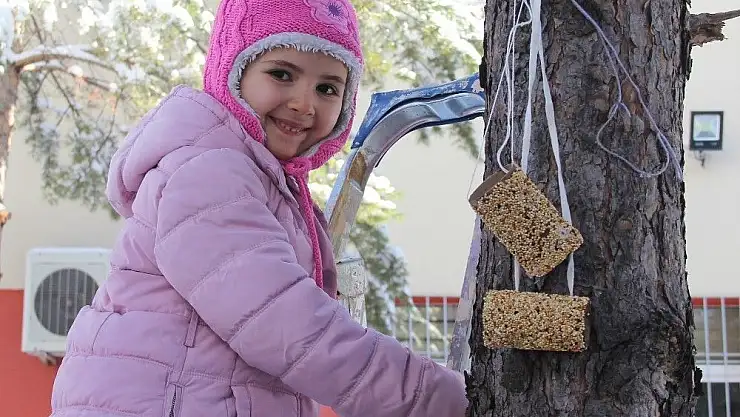 Sivas’ta ilkokul öğrencileri, kuşları soğuk havadan korumak için okulların bahçesindeki ağaçlara kuş yuvaları astı.