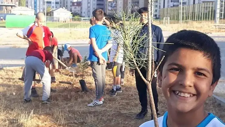 Kahramanmaraş´ta minik güreşçiler, farkındalık oluşturmak için çam fidanı dikti.