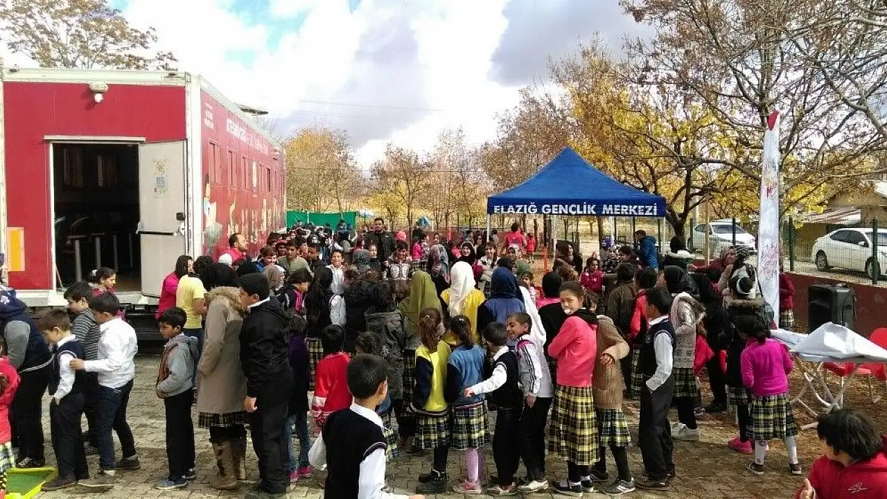 Elazığ’da okulları gezip çocuklara yeni oyunlar öğretip spora yönlendiren ’Mobil Gençlik Merkezi’ Kovancılar ilçesinde öğrencilerle buluştu.